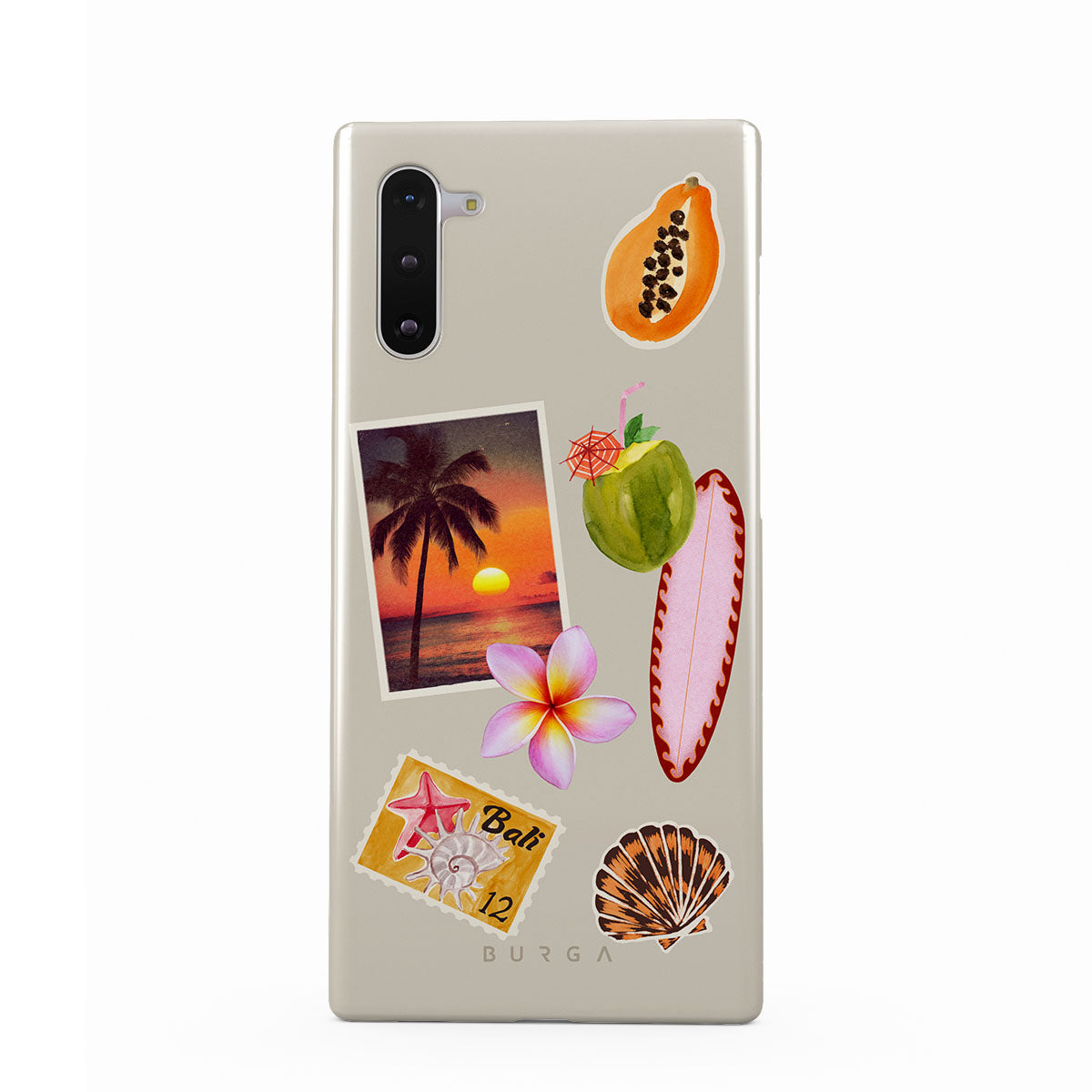Kenmerken van dit design: tropische zonsondergangsfoto, papaja, groene kokosnoot, roze surfplank, roze plumeria-bloem, oranje schelp, Bali-ansichtkaart.