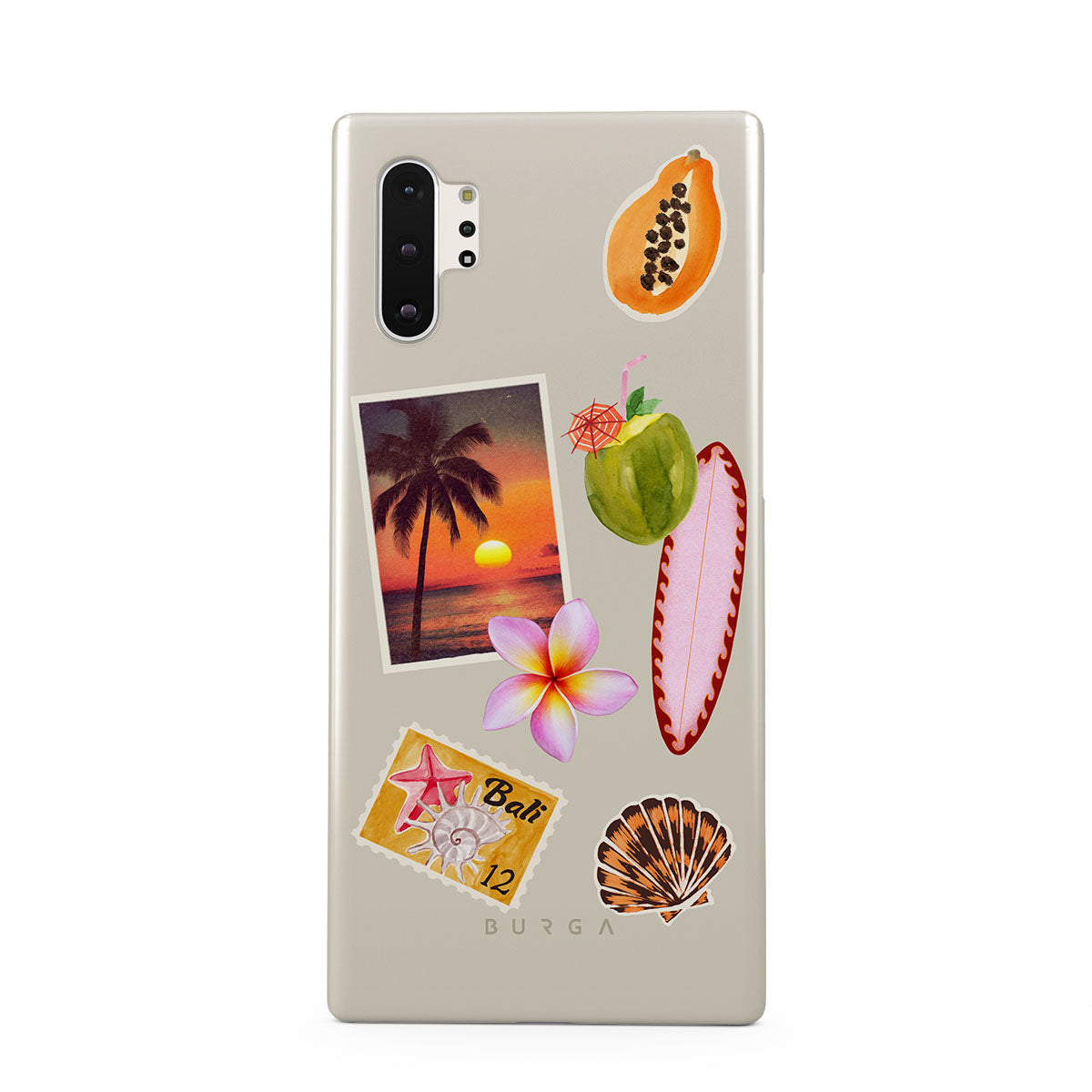 Kenmerken van dit design: tropische zonsondergangsfoto, papaja, groene kokosnoot, roze surfplank, roze plumeria-bloem, oranje schelp, Bali-ansichtkaart.