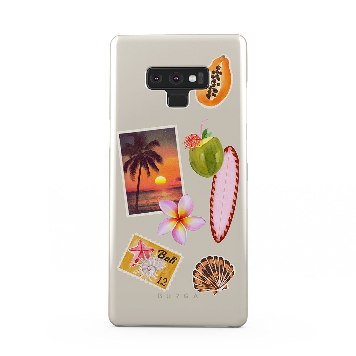 Kenmerken van dit design: tropische zonsondergangsfoto, papaja, groene kokosnoot, roze surfplank, roze plumeria-bloem, oranje schelp, Bali-ansichtkaart.