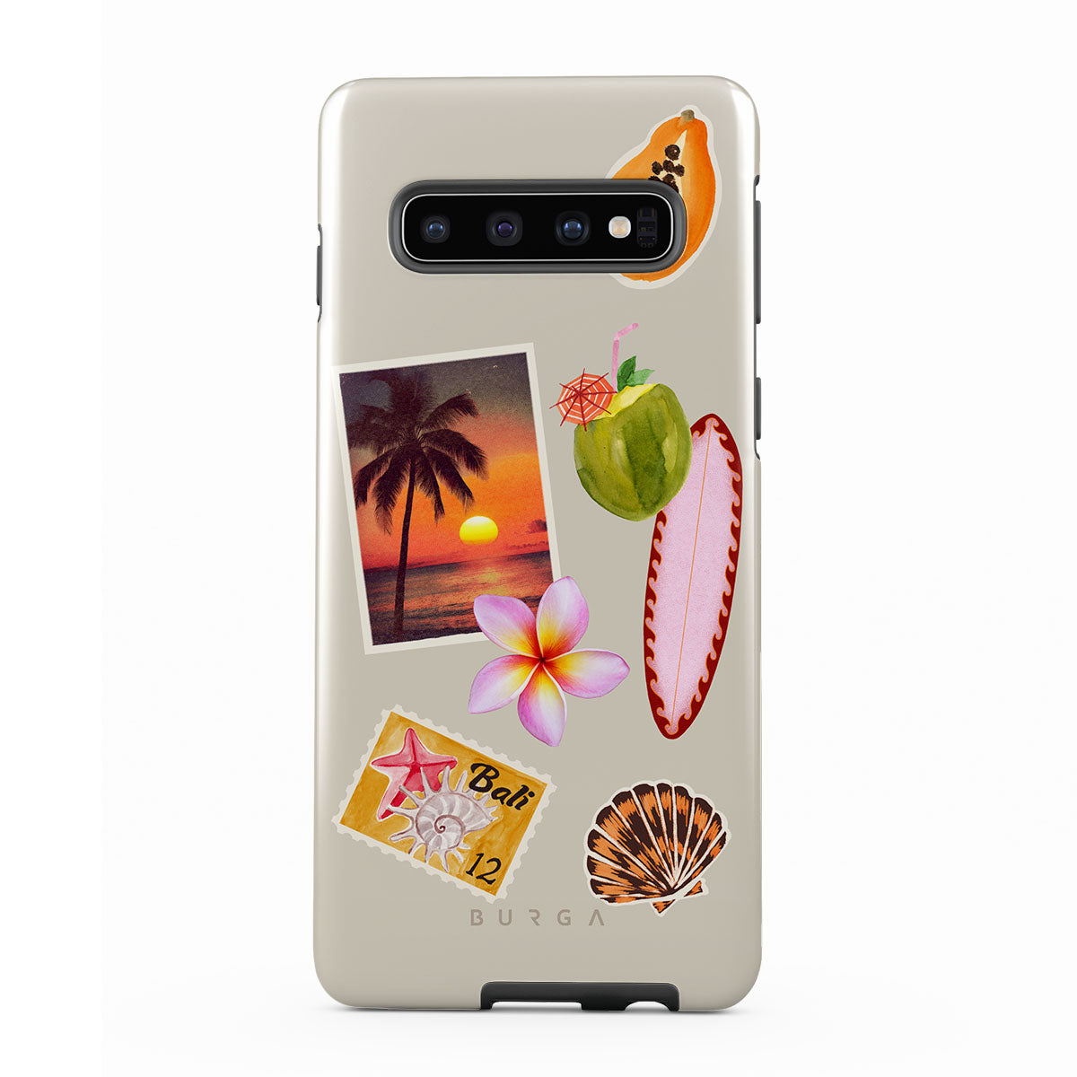 Kenmerken van dit design: tropische zonsondergangsfoto, papaja, groene kokosnoot, roze surfplank, roze plumeria-bloem, oranje schelp, Bali-ansichtkaart.