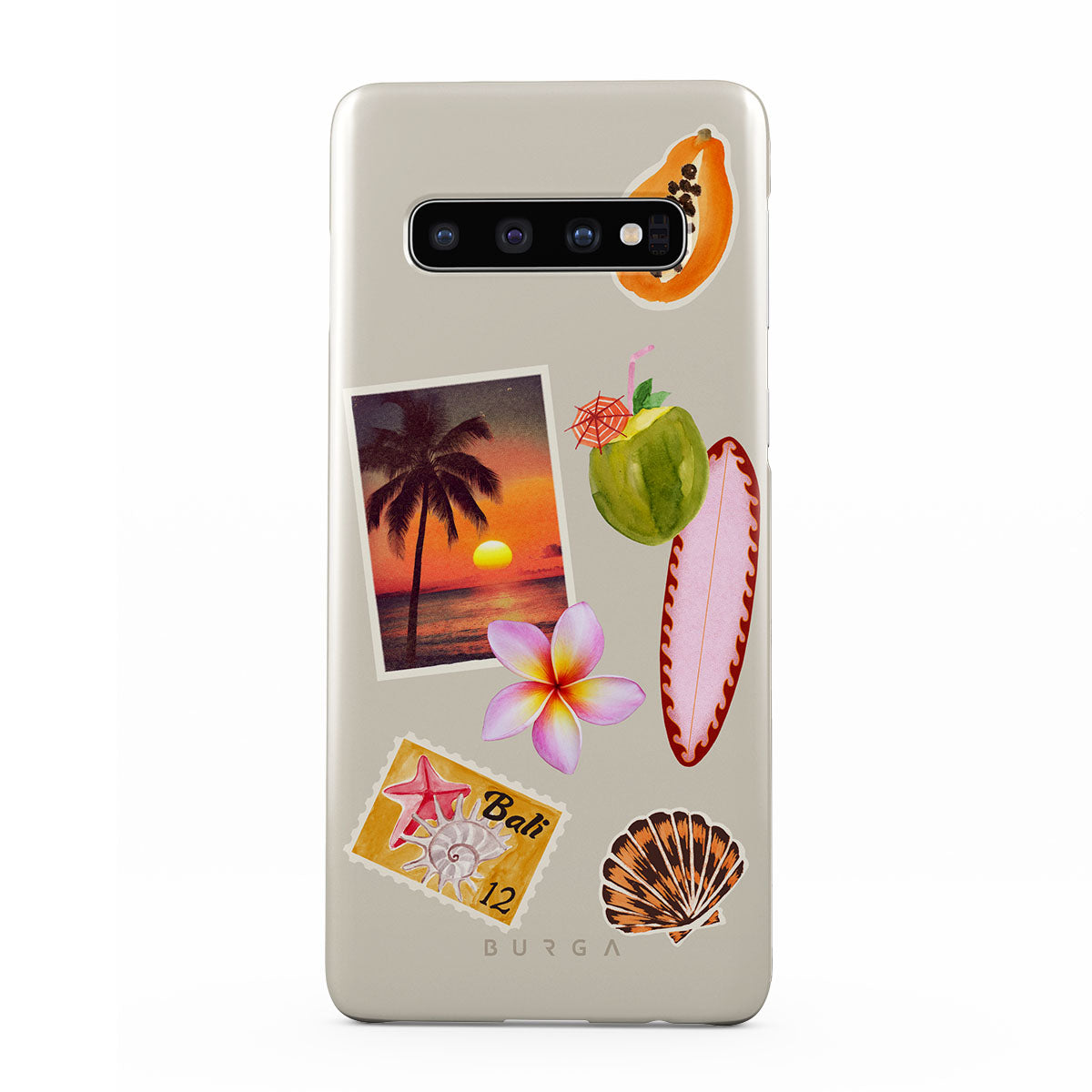 Kenmerken van dit design: tropische zonsondergangsfoto, papaja, groene kokosnoot, roze surfplank, roze plumeria-bloem, oranje schelp, Bali-ansichtkaart.
