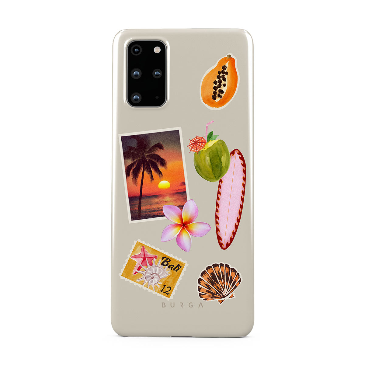 Kenmerken van dit design: tropische zonsondergangsfoto, papaja, groene kokosnoot, roze surfplank, roze plumeria-bloem, oranje schelp, Bali-ansichtkaart.