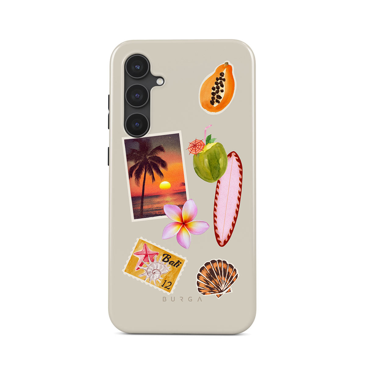 Kenmerken van dit design: tropische zonsondergangsfoto, papaja, groene kokosnoot, roze surfplank, roze plumeria-bloem, oranje schelp, Bali-ansichtkaart.