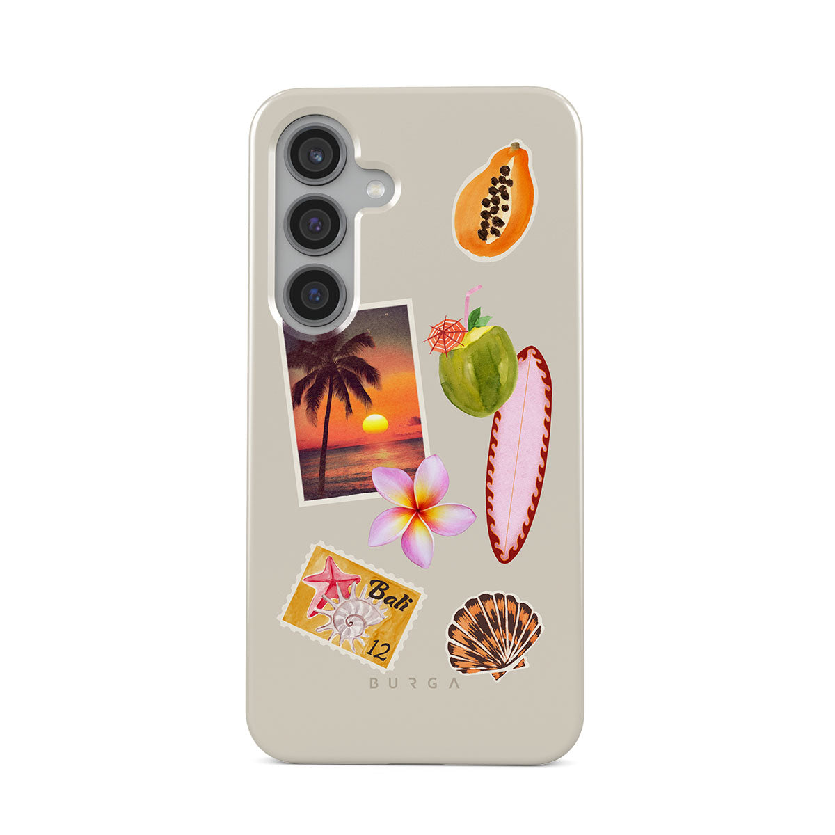 Kenmerken van dit design: tropische zonsondergangsfoto, papaja, groene kokosnoot, roze surfplank, roze plumeria-bloem, oranje schelp, Bali-ansichtkaart.