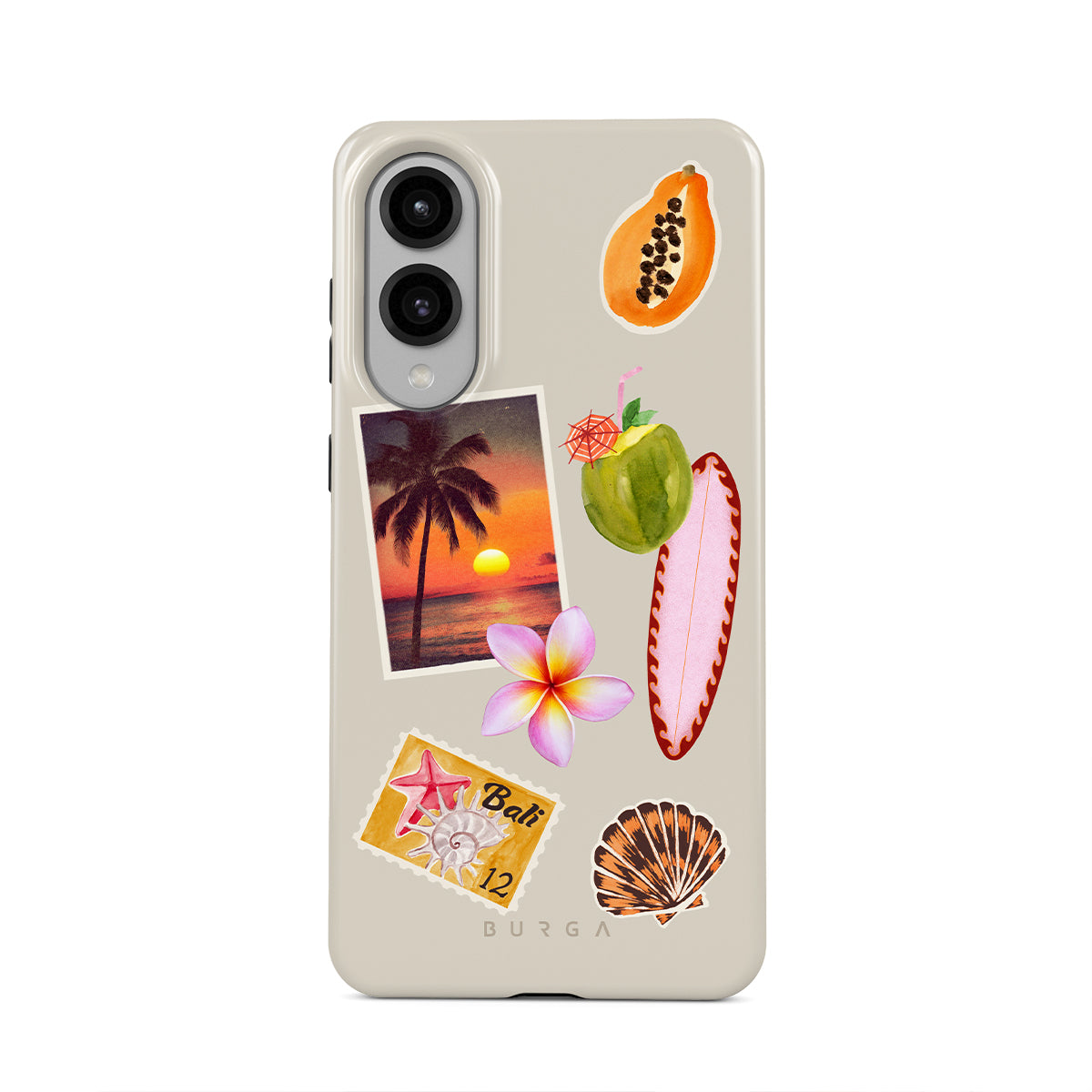 Kenmerken van dit design: tropische zonsondergangsfoto, papaja, groene kokosnoot, roze surfplank, roze plumeria-bloem, oranje schelp, Bali-ansichtkaart.
