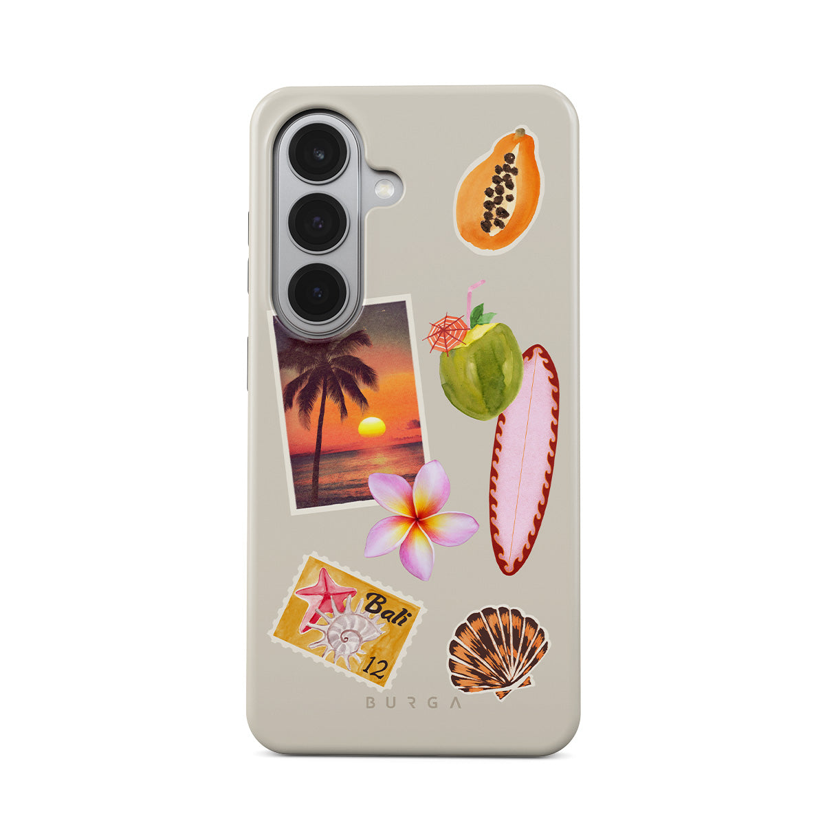 Kenmerken van dit design: tropische zonsondergangsfoto, papaja, groene kokosnoot, roze surfplank, roze plumeria-bloem, oranje schelp, Bali-ansichtkaart.