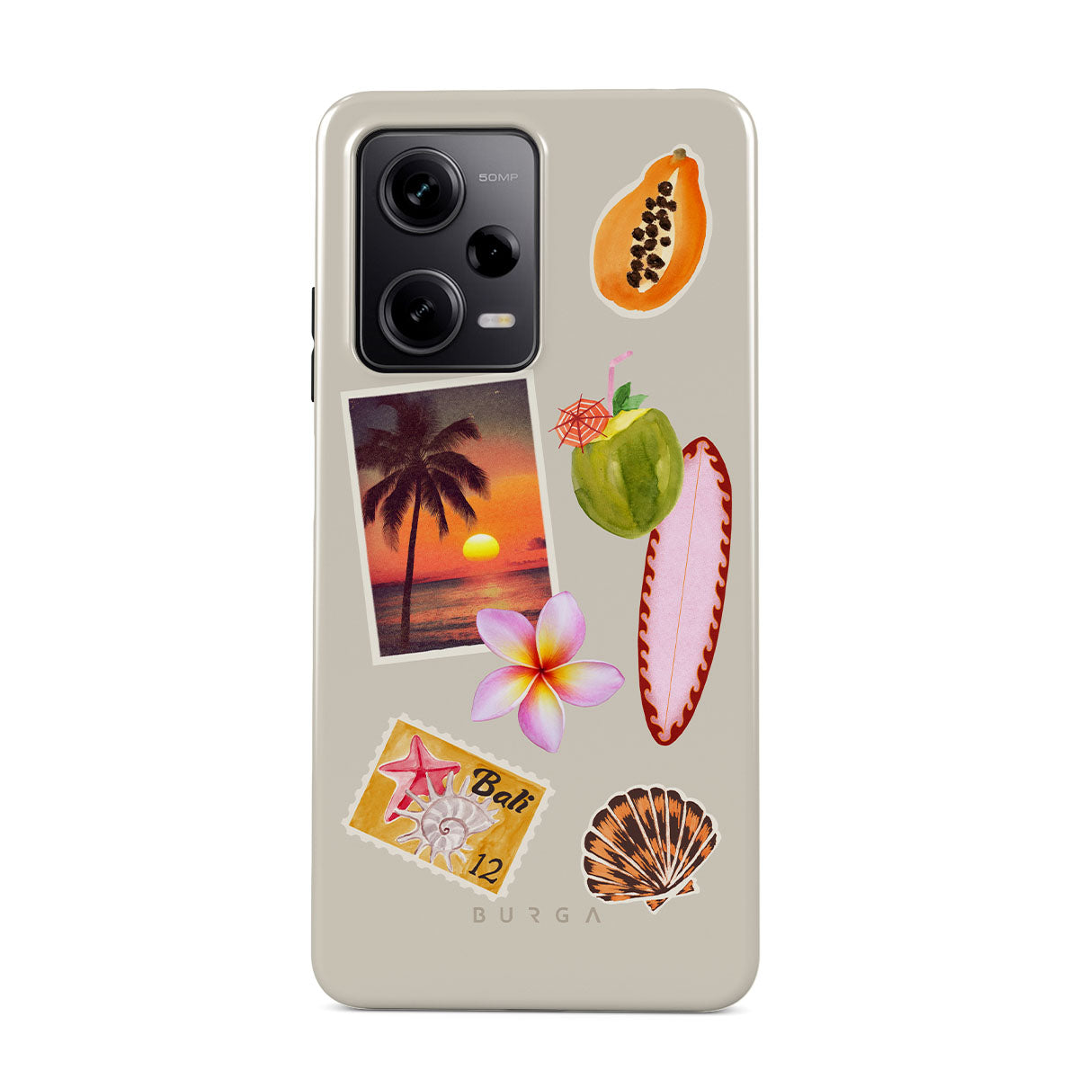 Kenmerken van dit design: tropische zonsondergangsfoto, papaja, groene kokosnoot, roze surfplank, roze plumeria-bloem, oranje schelp, Bali-ansichtkaart.