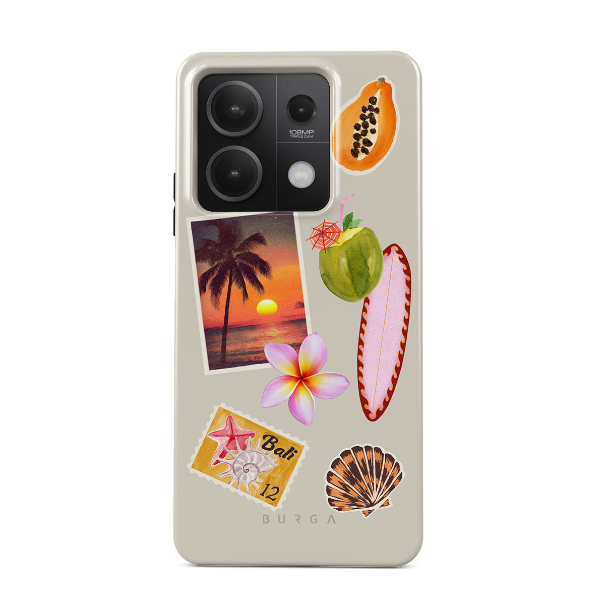 Kenmerken van dit design: tropische zonsondergangsfoto, papaja, groene kokosnoot, roze surfplank, roze plumeria-bloem, oranje schelp, Bali-ansichtkaart.