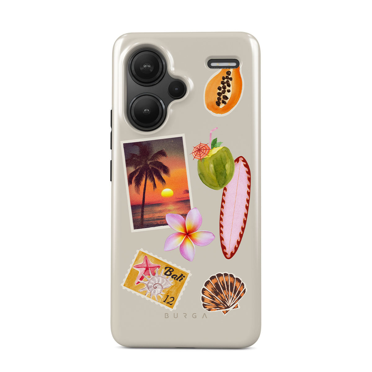 Kenmerken van dit design: tropische zonsondergangsfoto, papaja, groene kokosnoot, roze surfplank, roze plumeria-bloem, oranje schelp, Bali-ansichtkaart.