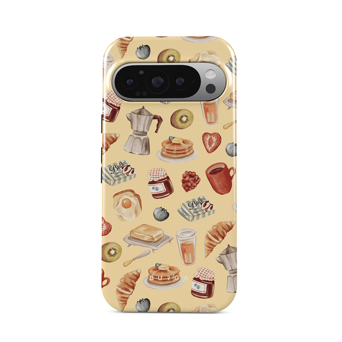 Kenmerken van dit design: ontbijt, pannenkoeken, jam, eieren, boter, koffie, snoep, fruit, sinaasappelsap, croissant