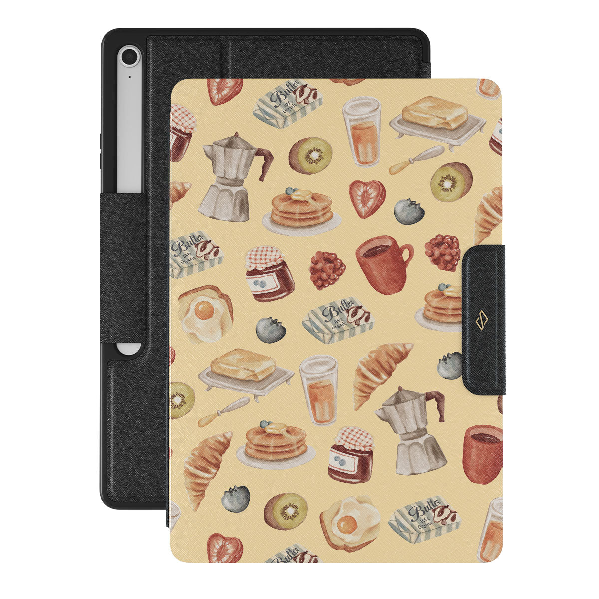 Kenmerken van dit design: ontbijt, pannenkoeken, jam, eieren, boter, koffie, snoep, fruit, sinaasappelsap, croissant