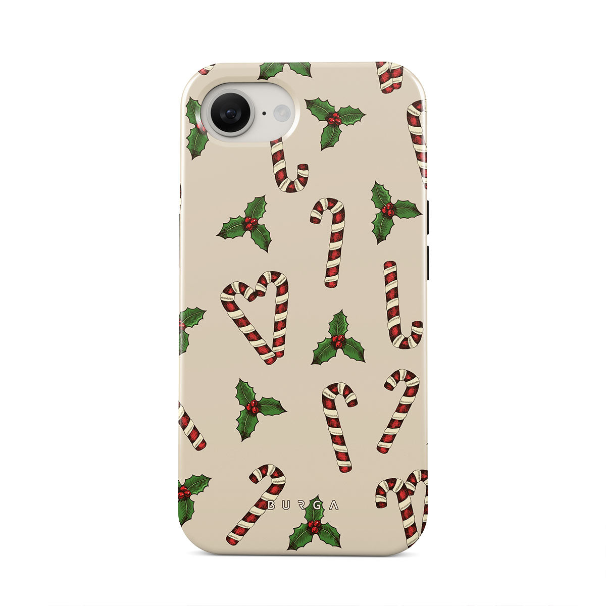 Dit ontwerp heeft: zuurstokken, hulst, groen, wit, feestelijk patroon