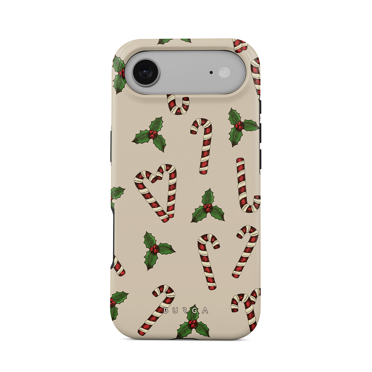Dit ontwerp heeft: zuurstokken, hulst, groen, wit, feestelijk patroon