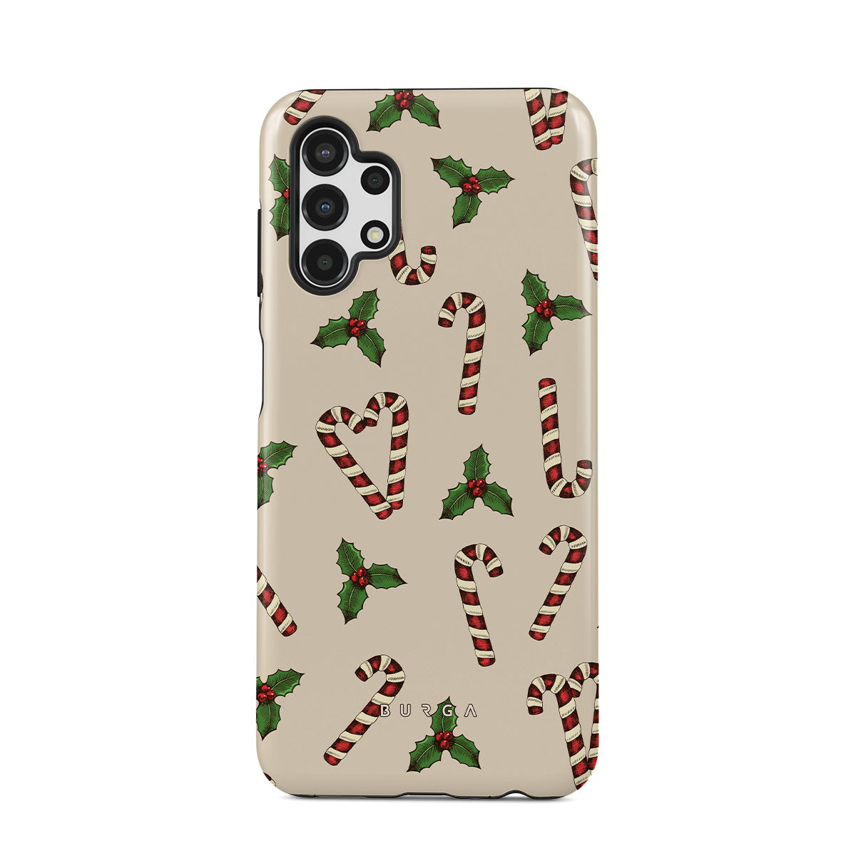 Dit ontwerp heeft: zuurstokken, hulst, groen, wit, feestelijk patroon
