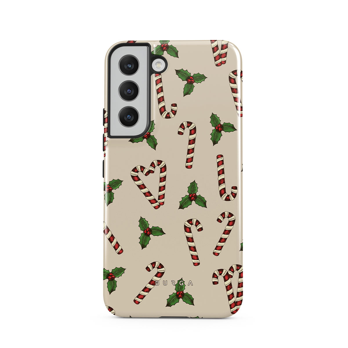 Dit ontwerp heeft: zuurstokken, hulst, groen, wit, feestelijk patroon