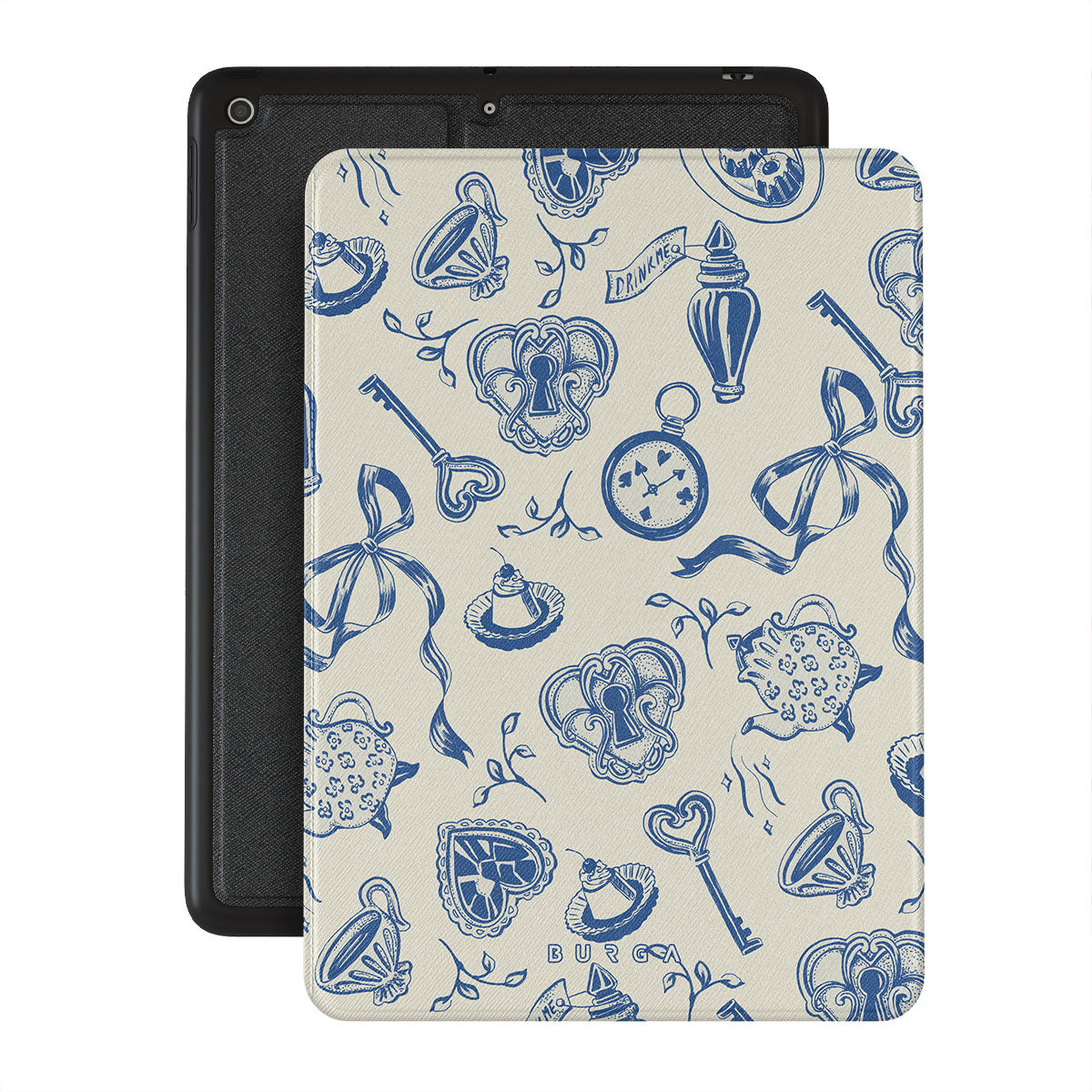 Kenmerken van dit design: theekopjes, theepotten, zakhorloges, sleutel, harten, keramiek, blauw-wit patroon