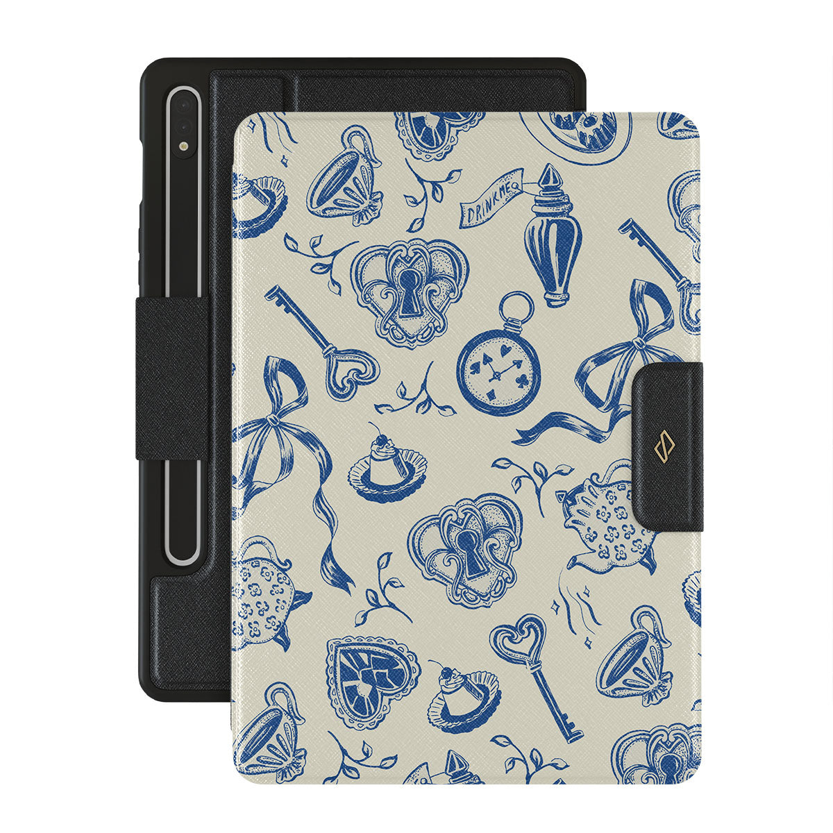 Kenmerken van dit design: theekopjes, theepotten, zakhorloges, sleutel, harten, keramiek, blauw-wit patroon