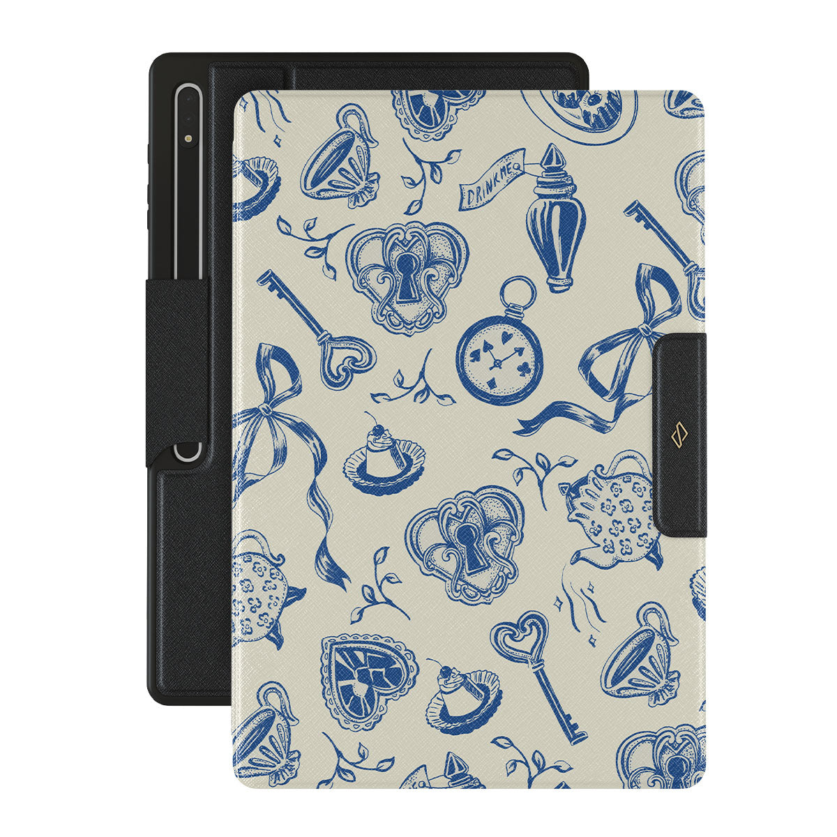 Kenmerken van dit design: theekopjes, theepotten, zakhorloges, sleutel, harten, keramiek, blauw-wit patroon