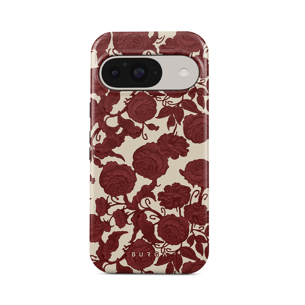 Dit ontwerp bevat: donkerrode rozen, ingewikkeld bloemmotief, vintage patroon.