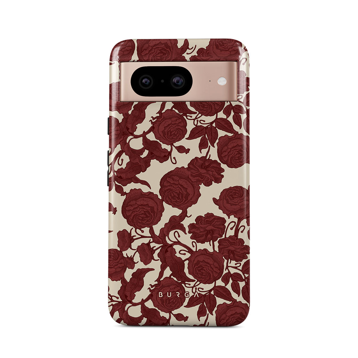 Dit ontwerp bevat: donkerrode rozen, ingewikkeld bloemmotief, vintage patroon.