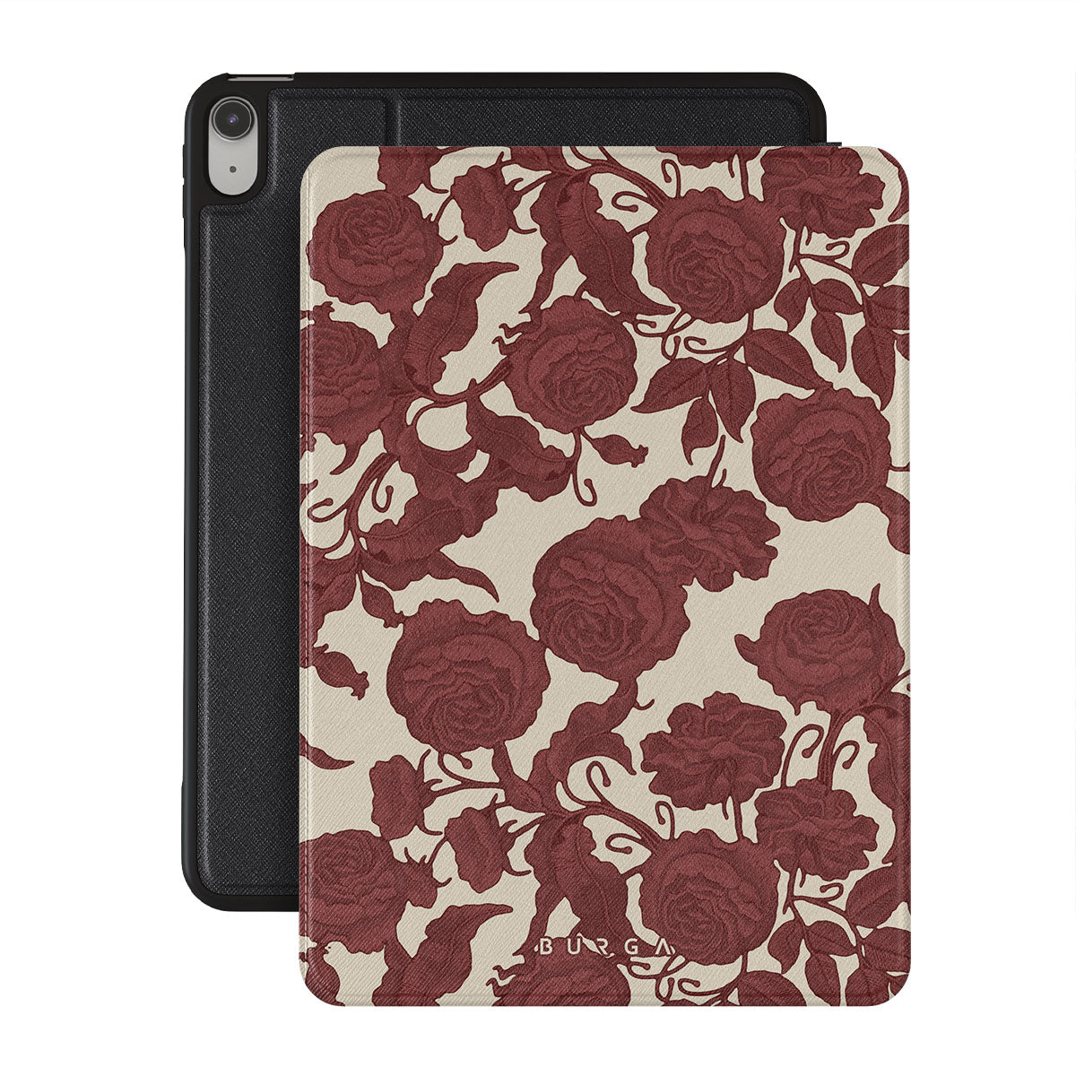 Dit ontwerp bevat: donkerrode rozen, ingewikkeld bloemmotief, vintage patroon.