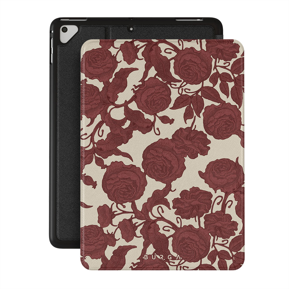Dit ontwerp bevat: donkerrode rozen, ingewikkeld bloemmotief, vintage patroon.