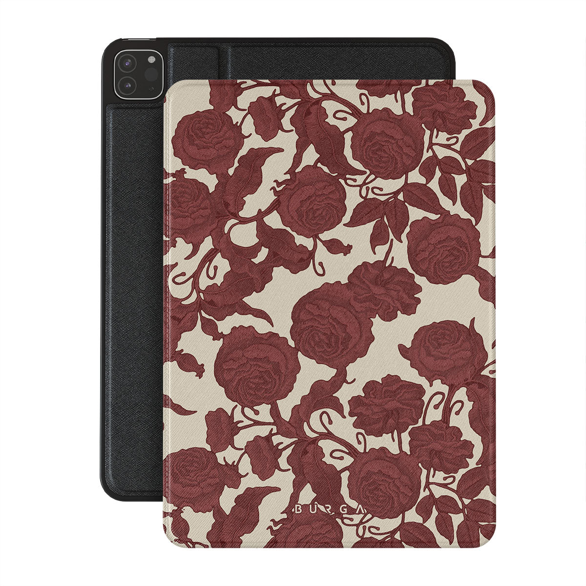 Dit ontwerp bevat: donkerrode rozen, ingewikkeld bloemmotief, vintage patroon.