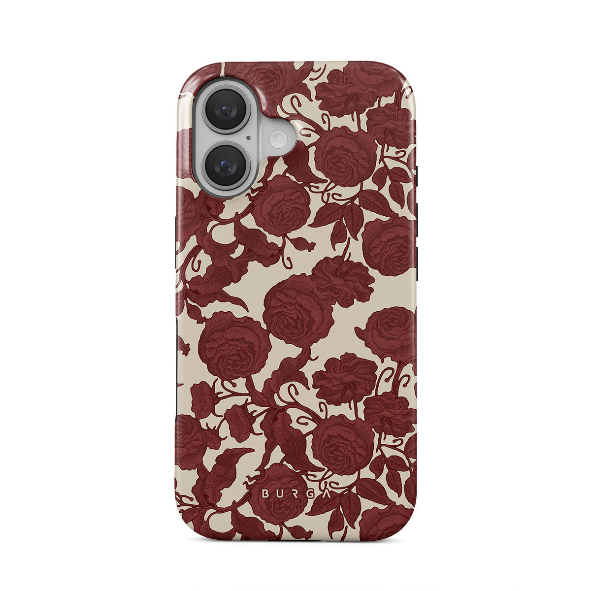 Dit ontwerp bevat: donkerrode rozen, ingewikkeld bloemmotief, vintage patroon.