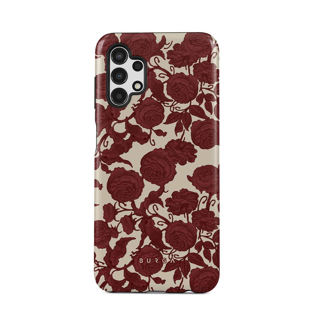 Dit ontwerp bevat: donkerrode rozen, ingewikkeld bloemmotief, vintage patroon.