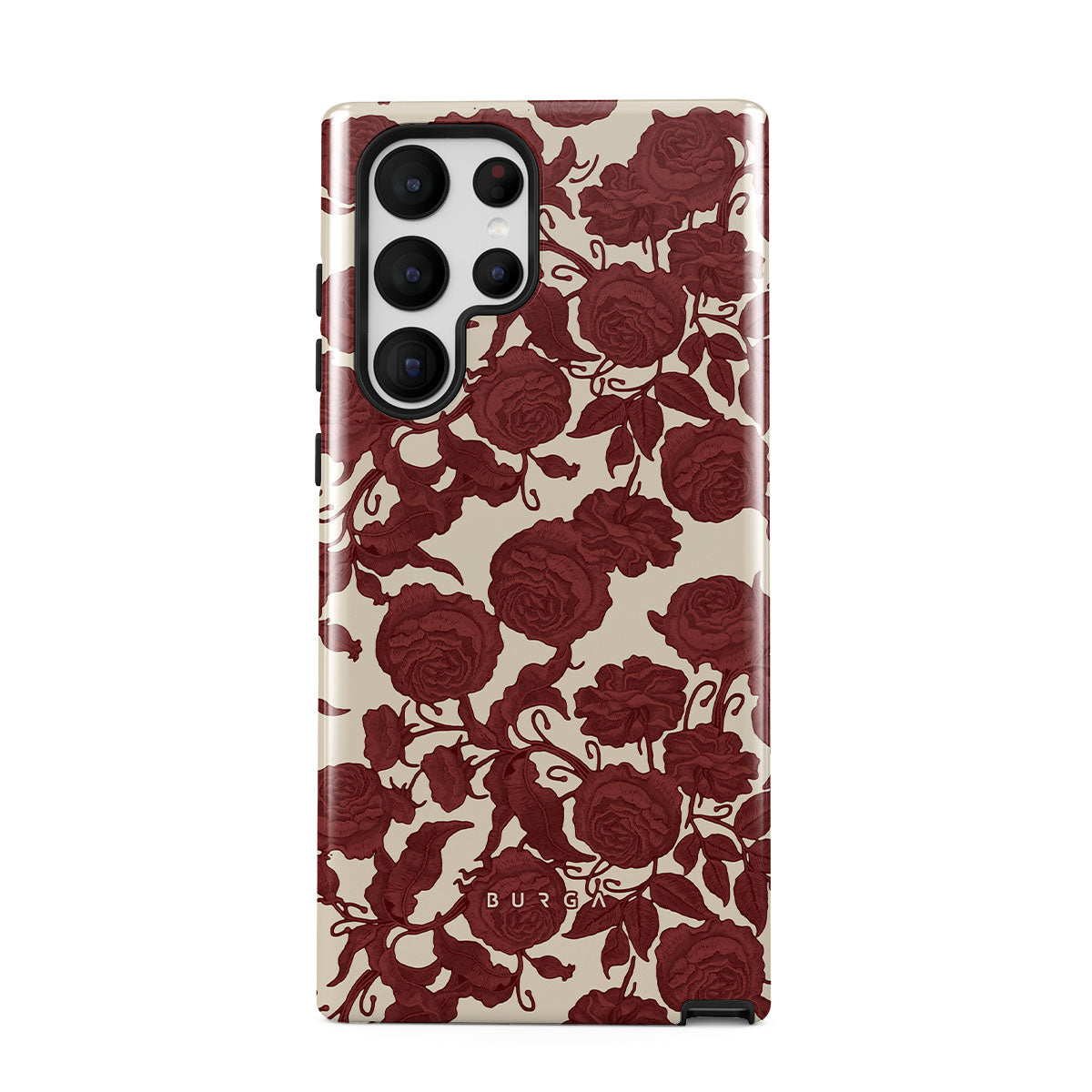 Dit ontwerp bevat: donkerrode rozen, ingewikkeld bloemmotief, vintage patroon.
