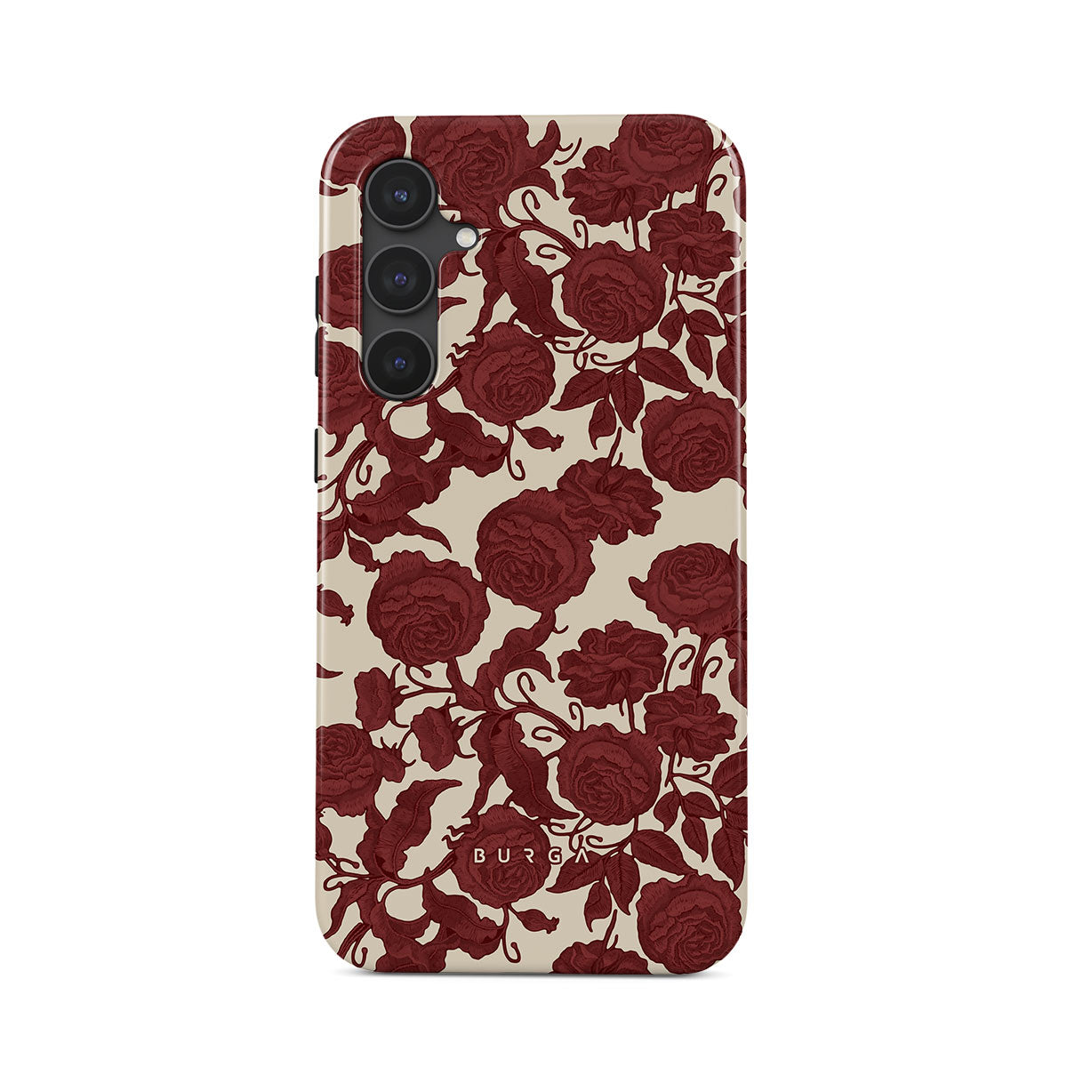 Dit ontwerp bevat: donkerrode rozen, ingewikkeld bloemmotief, vintage patroon.
