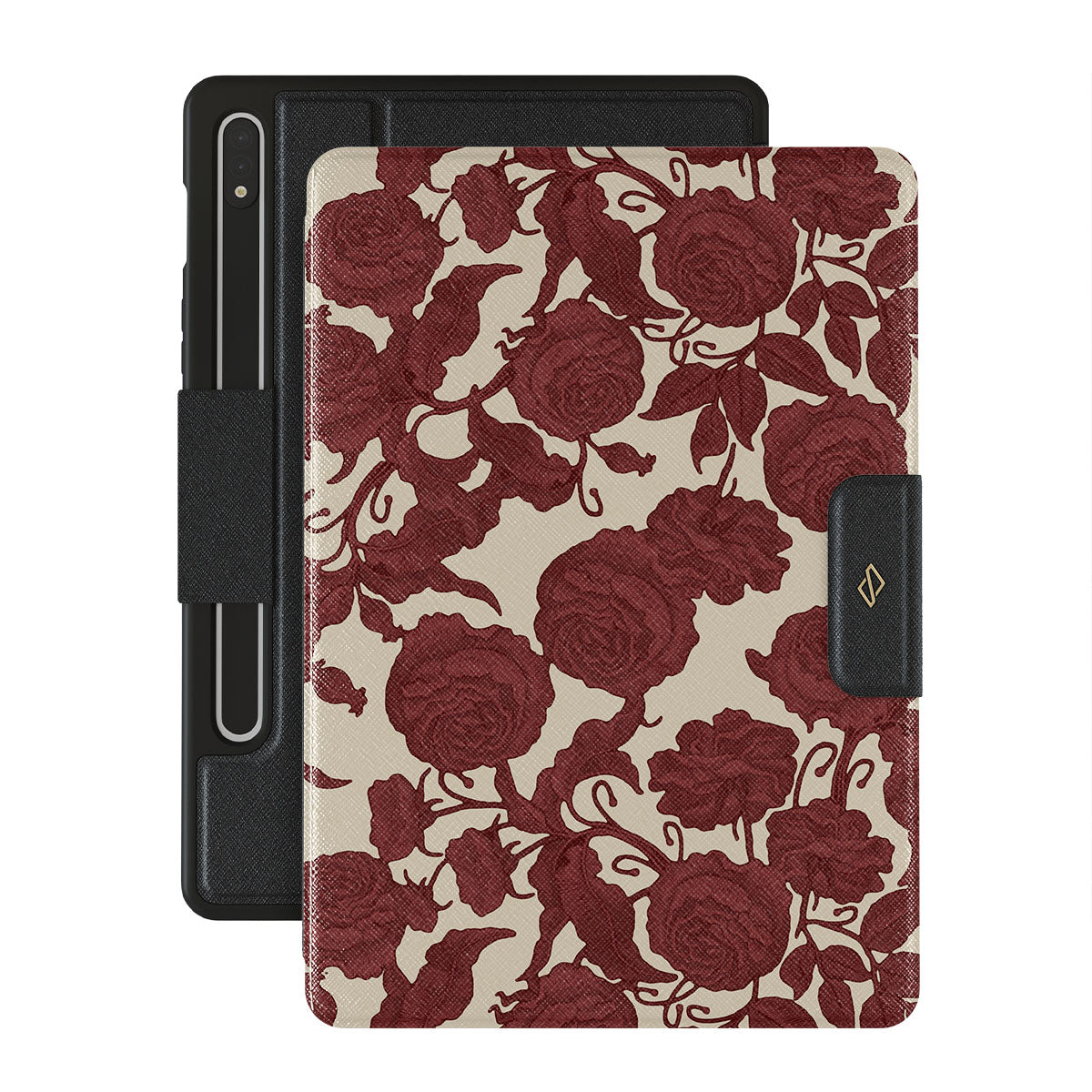 Dit ontwerp bevat: donkerrode rozen, ingewikkeld bloemmotief, vintage patroon.