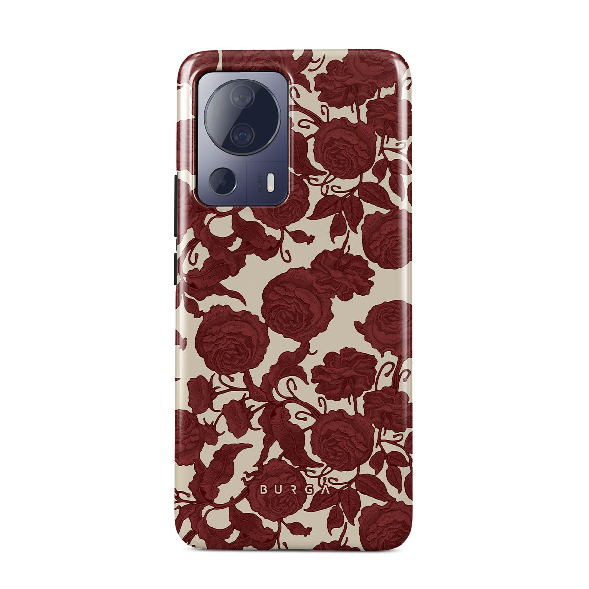 Dit ontwerp bevat: donkerrode rozen, ingewikkeld bloemmotief, vintage patroon.