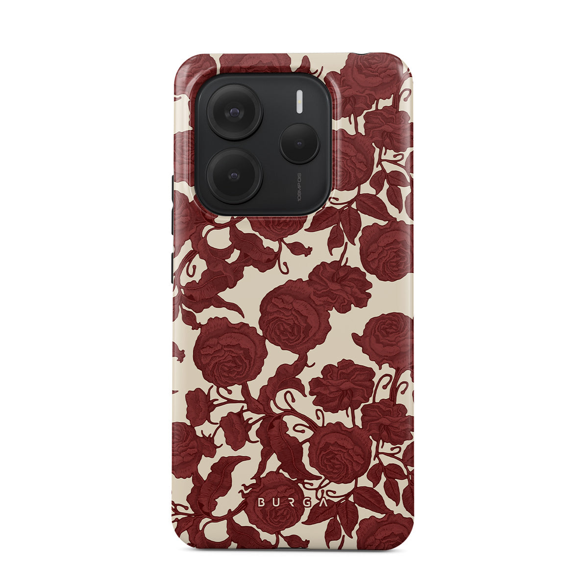 Dit ontwerp bevat: donkerrode rozen, ingewikkeld bloemmotief, vintage patroon.