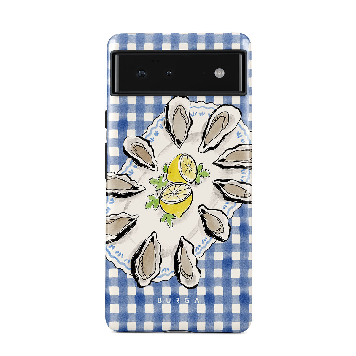 Kenmerken van dit design: Oesters, citroen, blauwe gingham, frisse kustmotieven, zachte pasteltinten.