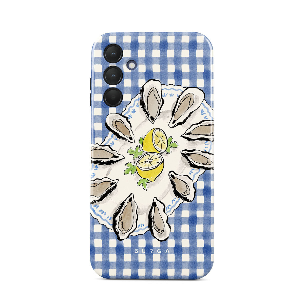 Kenmerken van dit design: Oesters, citroen, blauwe gingham, frisse kustmotieven, zachte pasteltinten.