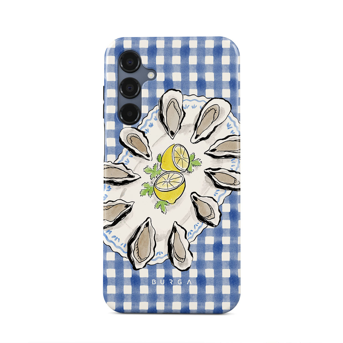 Kenmerken van dit design: Oesters, citroen, blauwe gingham, frisse kustmotieven, zachte pasteltinten.