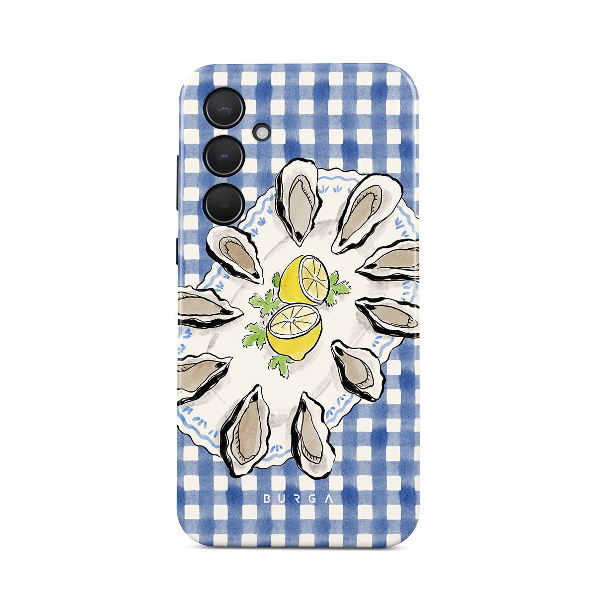 Kenmerken van dit design: Oesters, citroen, blauwe gingham, frisse kustmotieven, zachte pasteltinten.