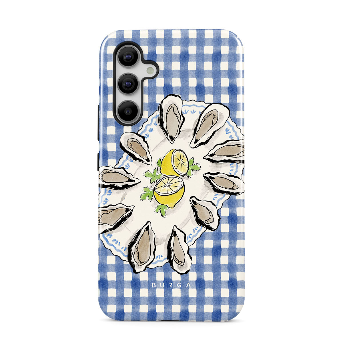 Kenmerken van dit design: Oesters, citroen, blauwe gingham, frisse kustmotieven, zachte pasteltinten.