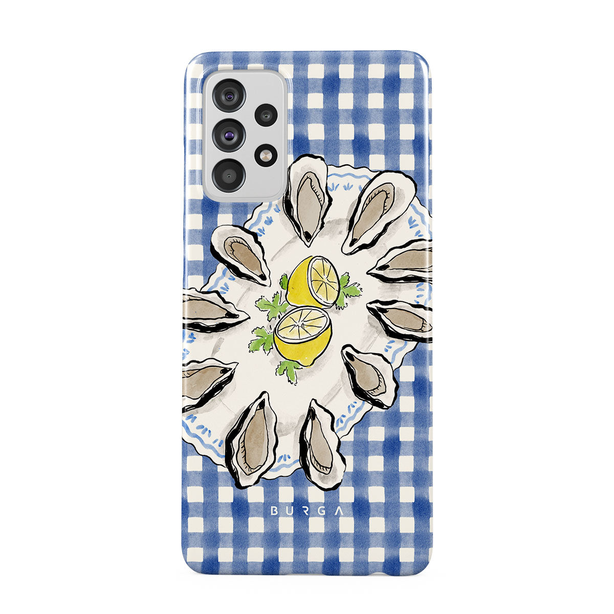 Kenmerken van dit design: Oesters, citroen, blauwe gingham, frisse kustmotieven, zachte pasteltinten.