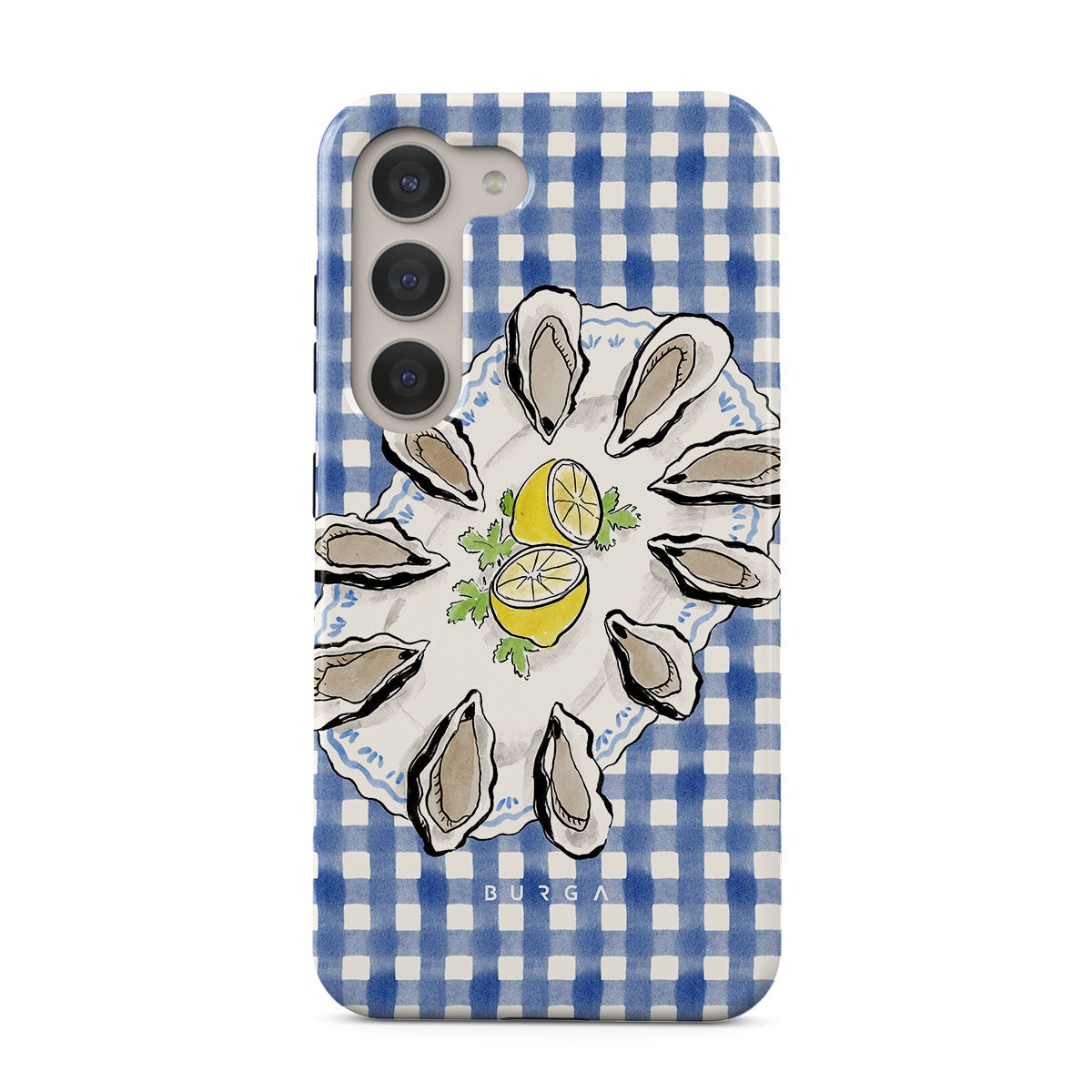 Kenmerken van dit design: Oesters, citroen, blauwe gingham, frisse kustmotieven, zachte pasteltinten.