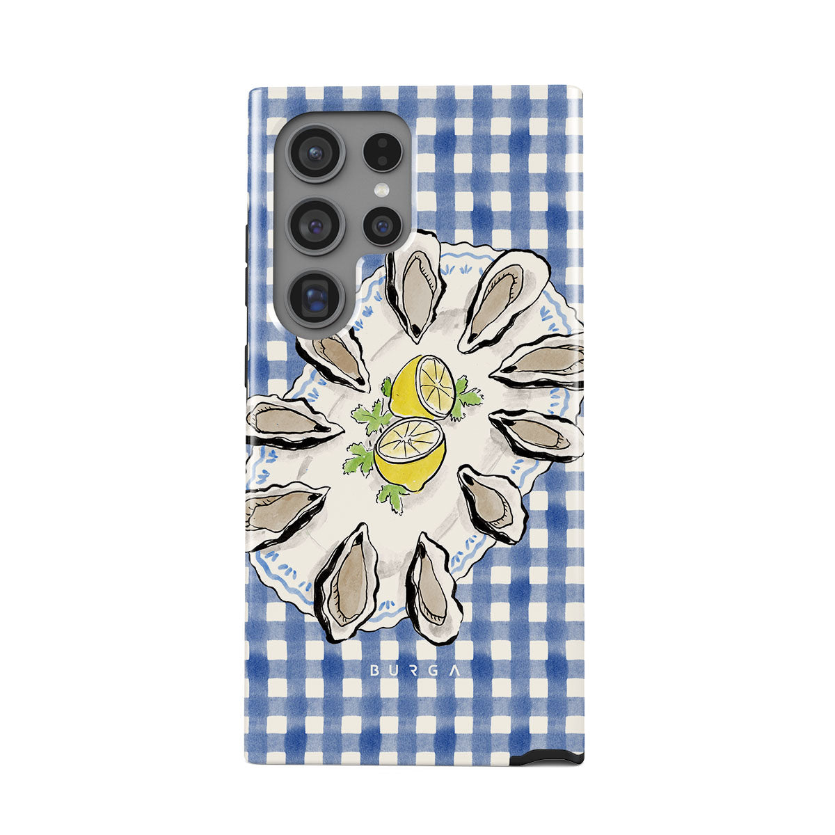 Kenmerken van dit design: Oesters, citroen, blauwe gingham, frisse kustmotieven, zachte pasteltinten.