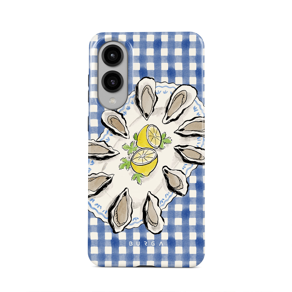 Kenmerken van dit design: Oesters, citroen, blauwe gingham, frisse kustmotieven, zachte pasteltinten.