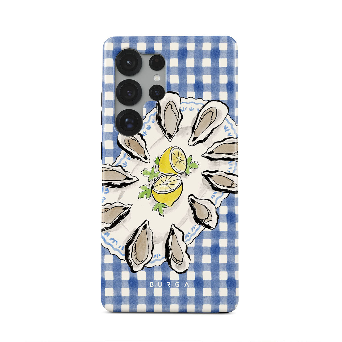 Kenmerken van dit design: Oesters, citroen, blauwe gingham, frisse kustmotieven, zachte pasteltinten.