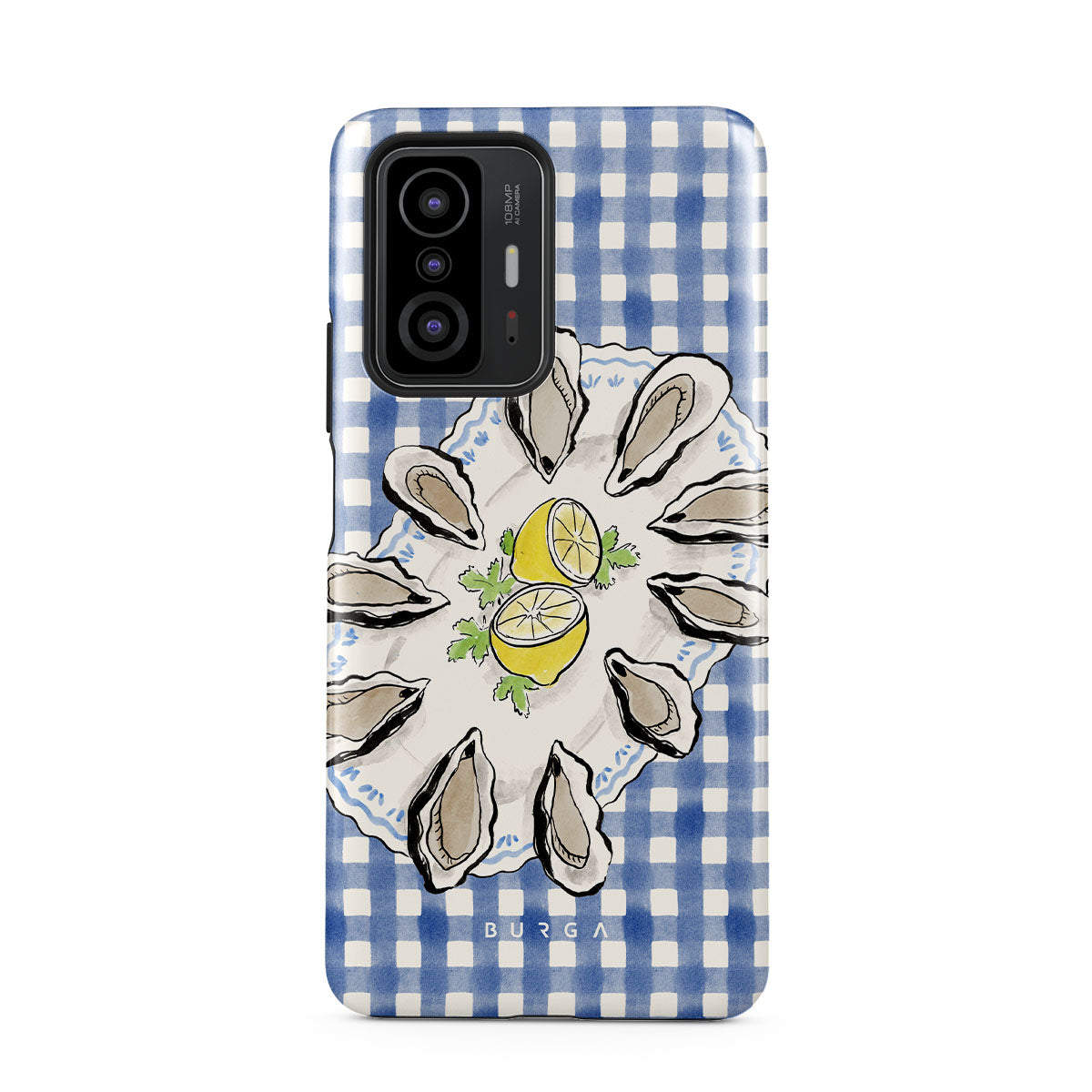 Kenmerken van dit design: Oesters, citroen, blauwe gingham, frisse kustmotieven, zachte pasteltinten.