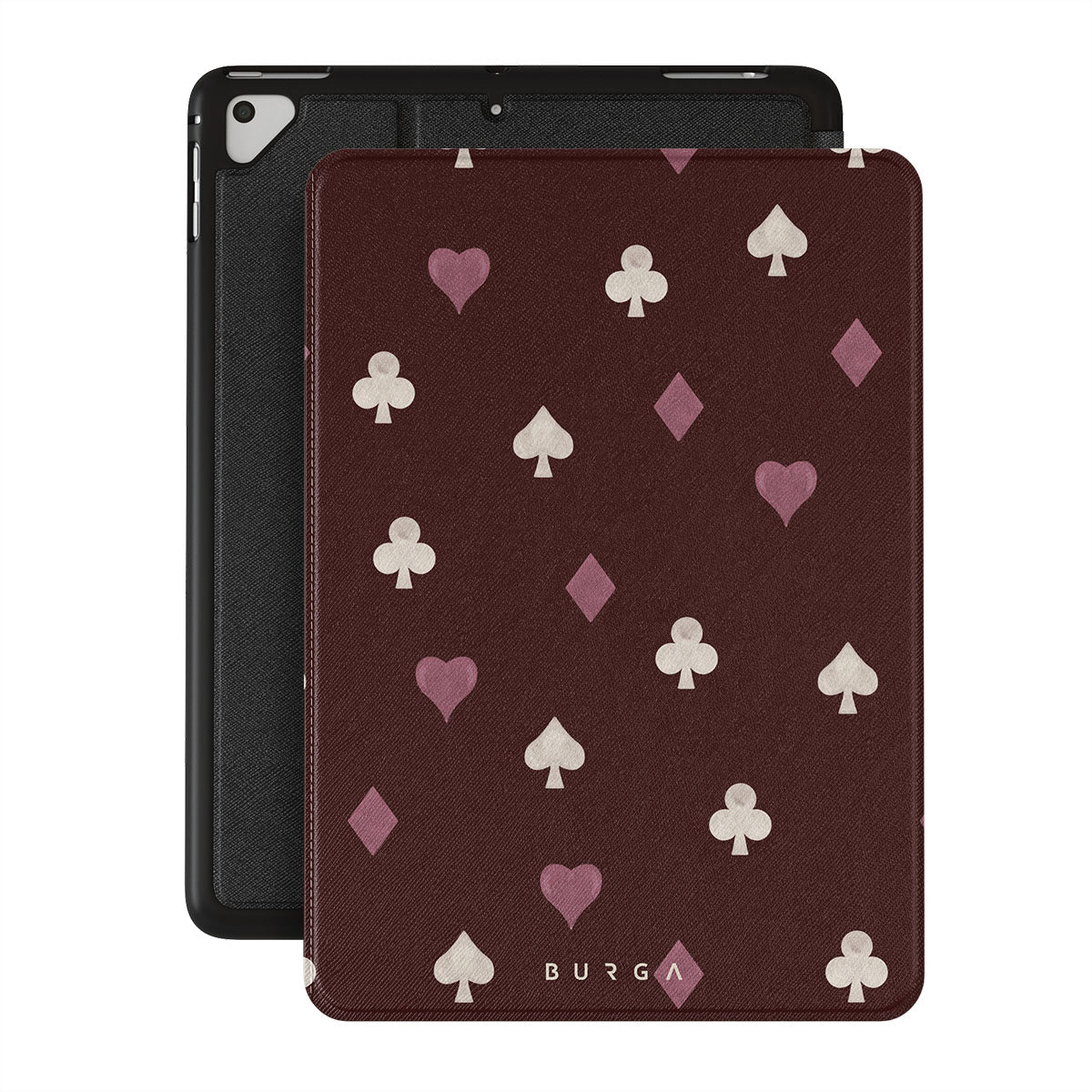 Kenmerken van dit design: kaartspel symbolen, harten, schoppen, ruiten, klaveren, bordeauxrode achtergrond
