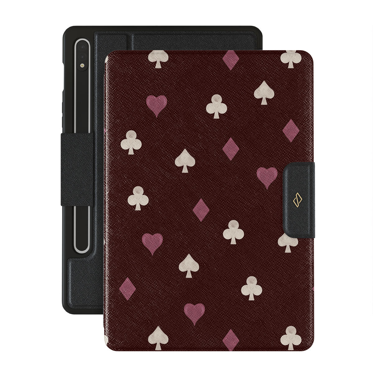 Kenmerken van dit design: kaartspel symbolen, harten, schoppen, ruiten, klaveren, bordeauxrode achtergrond