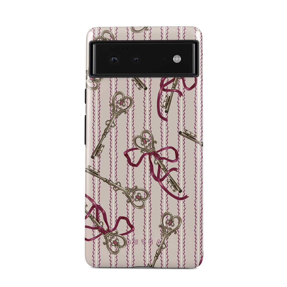 Kenmerken van dit design: antieke sleutels, strikken, roze linten, gestreepte achtergrond
