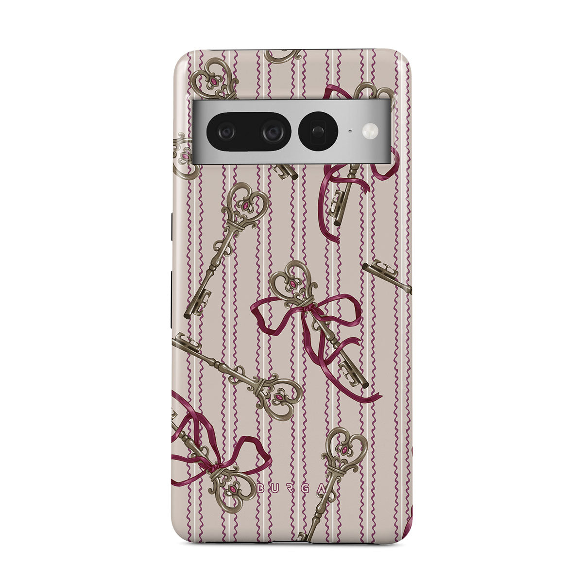 Kenmerken van dit design: antieke sleutels, strikken, roze linten, gestreepte achtergrond