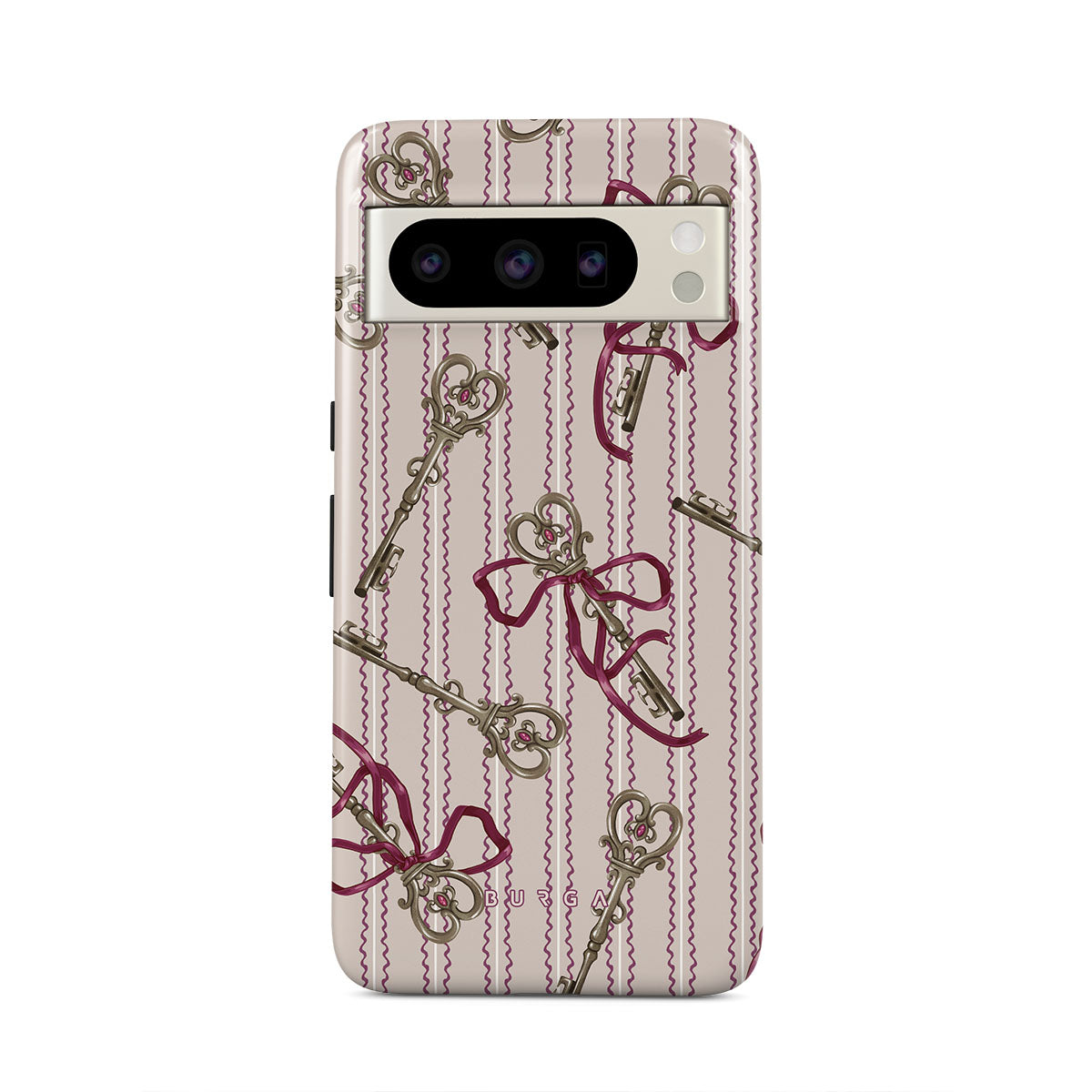 Kenmerken van dit design: antieke sleutels, strikken, roze linten, gestreepte achtergrond